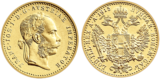 Jeśli chodzi o dukata, to rewers tej złotej monety przedstawia prawy profil austriackiego władcy, cesarza Franciszka Józefa I, Austrii od 1848 roku oraz także króla Węgier od 1867 roku. Został koronowany w 1867 roku. Swoje rządy sprawował on aż do 1916 roku. Awers z kolei prezentuje wizerunek godła Austrii, charakterystycznego orła o dwóch głowach i ogonach. W otoku znajduje się napis "Hungar bohem gal lod ill rex a a" wraz z datą 1915 roku. Napis oznacza "Węgier, Czech, Galicji, Lodomerii, Ilirii, Król i Arcyksiążę Austrii". Sam zaś Franciszek Józef I urodził się 18 sierpnia 1830 roku w pałacu Schönbrunn koło Wiednia, zmarł zaś 21 listopada 1916 roku. Dukat ma masę 3,49g (zawartość czystego złota to 3,44g) i średnicę 19,75mm.